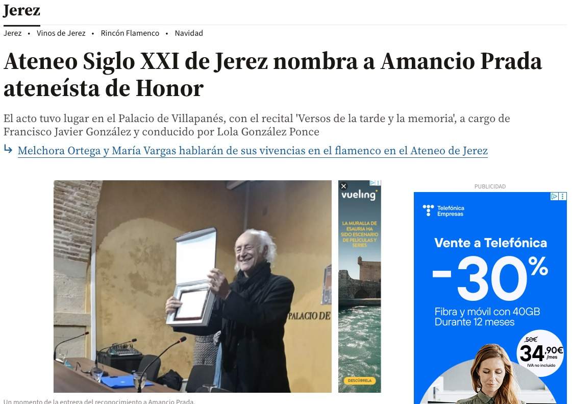 Ateneo Siglo XXI de Jerez nombra a Amancio Prada ateneísta de Honor